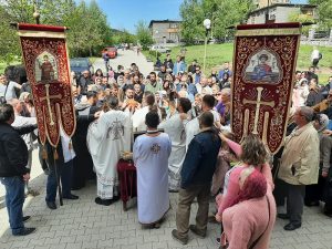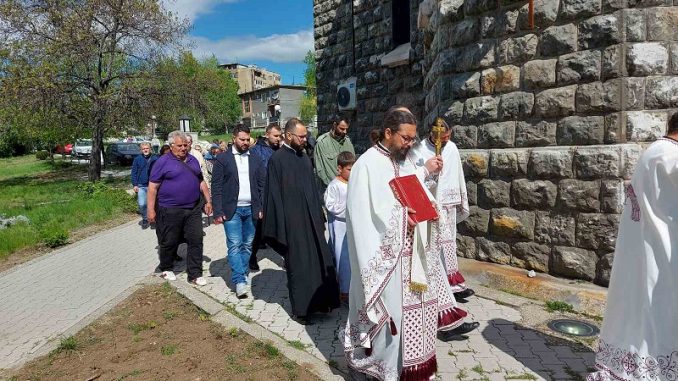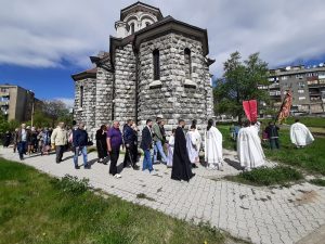 По завршетку свете литургије свештенство је са својим верним народом изашло у свечану трократну литију око храма, након које је пререзан славски колач.