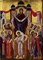 Тропар (глас 4):Днес благовјернији људије свјетло празднујем, осјењајеми твојим Богомати пришествијем, и к твојему взирајушче пречистому образу, умилно глагољем: покриј нас честним твојим покровом и избави нас от всјакаго зла, мољашчи Сина твојего Христа Бога нашего спасти души нашја.