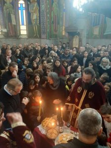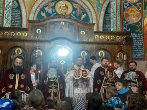На крају Свете Литургије свештеници су са децом и градоначелником Бора г. Александром Миликићем пресекли славски колач који су саборно принела деца са својим вероучитељима из свих борских основних школа.
